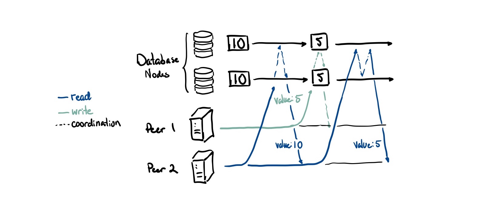 However it isn’t without downsides either. Achieving this property adds a lot of overhead because both writes and reads need to coordinate (the dashed lines in the diagram above) across all database nodes to ensure consistency. This creates an availability problem: if you can’t reach a majority of your nodes, you can’t process any operations.1
