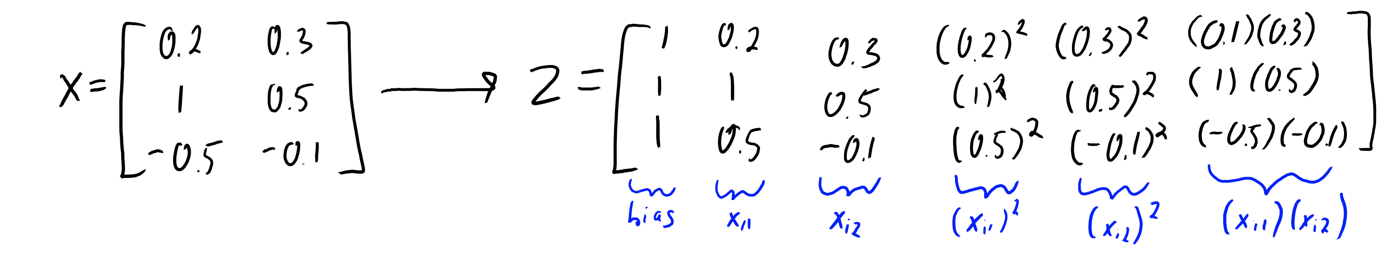Effectively by constructing new features that take the variable to certain powers. To get a y-intercept (bias), we just raise to the 0th power to get 1. We can fit polynomials of degree by raising other powers:
