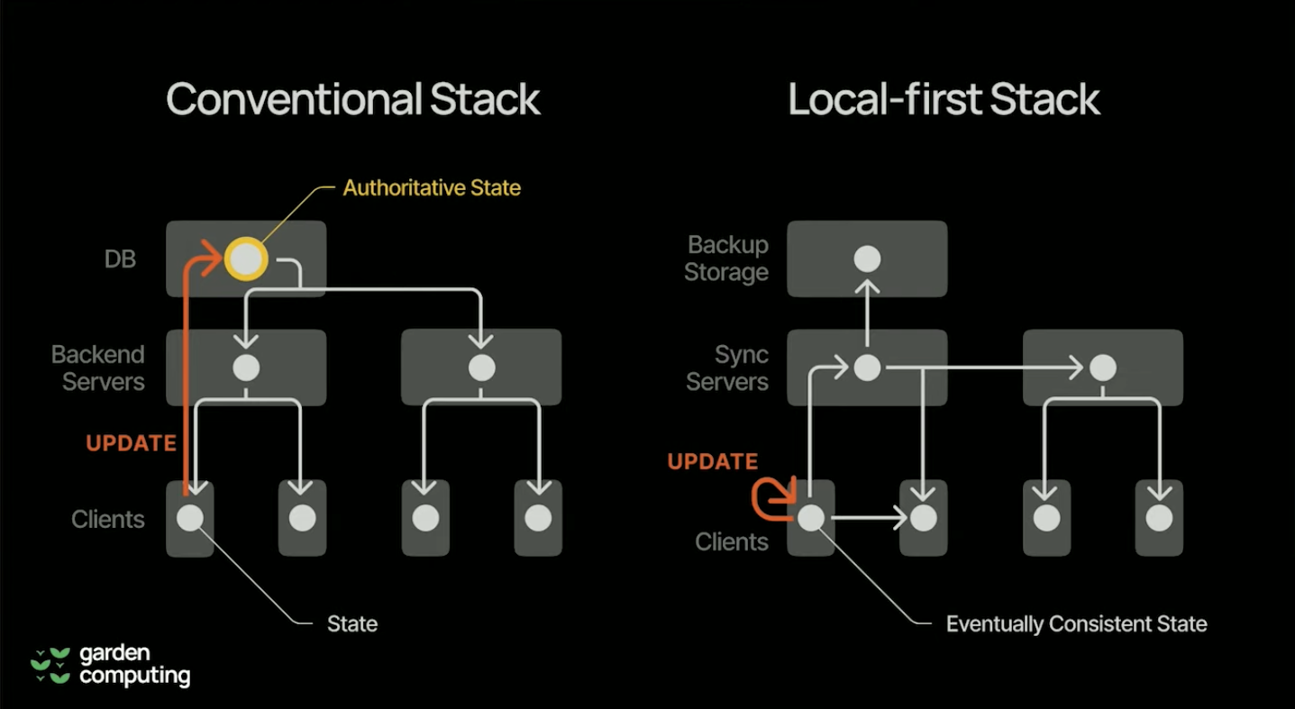 The key difference between traditional systems and local-first systems is not an absence of servers, but a change in their responsibilities: they are in a supporting role, not the source of truth.