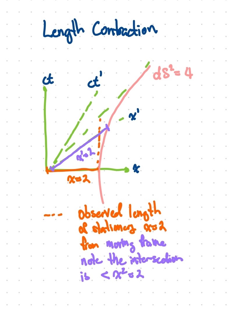 We can use the Minkowski Invariant Hyperbola to visualize how spatial distances are mapped in different frames via the Lorentz Transformation. The Lorentz transformation relates two inertial frames of reference, where an observer stationary at the event (0, 0) makes a change of velocity along the x-axis.